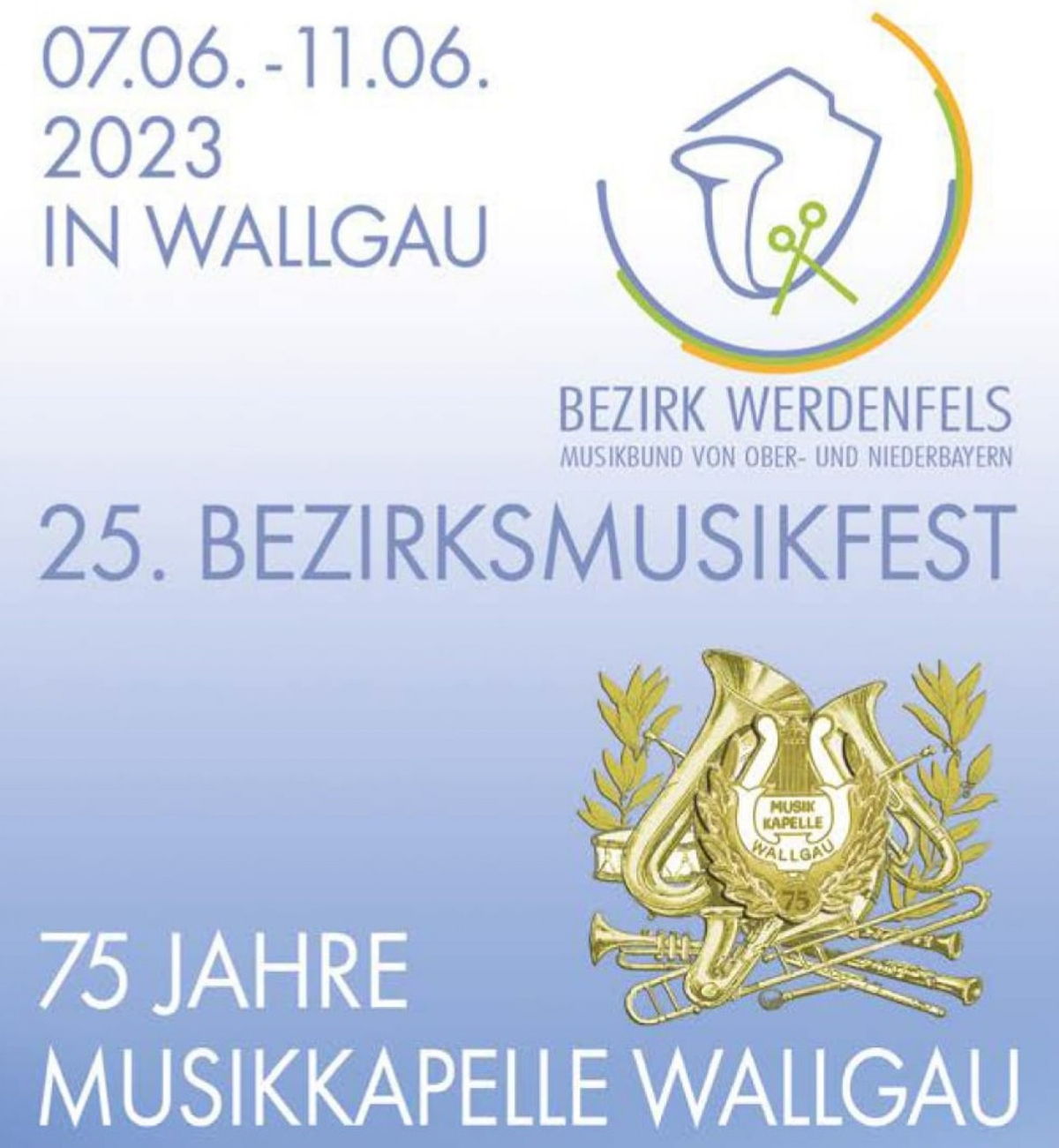 Die Musikkapelle Wallgau feiert im Jahre 2023 ihr 75-jähriges Bestehen. Aus diesem Grund veranstaltet Sie 2023 eine Festwoche vom Mittwoch 07. Juni bis Sonntag 11. Juni. Am Festsonntag, 11. Juni richtet Sie das 25. Bezirksmusikfest des MON Bezirks Werdenfels aus.